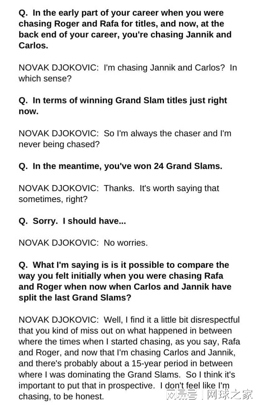 有记者问:“在你生涯早期,当你追逐罗杰和拉法争夺冠军时……而现在在职业生涯末期,你在追逐扬尼克和卡洛斯……”